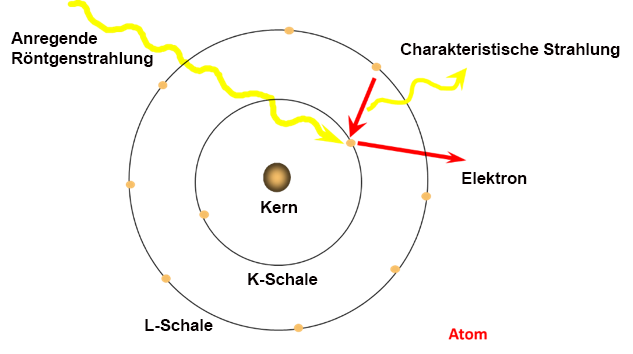 Der Prozess der Röntgenfluoreszenz beginnt mit einem primären Röntgenstrahl, der in der Regel mit einer Röntgenröhre erzeugt wird. Diese Anregungsstrahlung trifft auf ein Kern-nahes Elektron des Atoms und entfernt das Elektron aus dem Atom. Die offene Position wird von einem Elektron aus einer weiter entfernten Elektronenschale gefüllt, dabei wird Fluoreszenzstrahlung abgegeben. Die Energie dieser Strahlung ist charakteristisch für das spezifische Atom und kann damit zu einer qualitativen Analyse, welche Atome in der Probe vorhanden sind, verwendet werden.