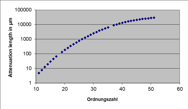 Warum ist die Probenvorbereitung so wichtig? Das liegt daran, dass die Tiefe, aus der die Fluoreszenzstrahlung erfasst werden kann, je nach der Energie der Röntgenstrahlen ziemlich gering sein kann. Darüber hinaus ist dieser Effekt auch matrixspezifisch. Allgemein gefasst: Je schwerer die Probenmatrix, desto geringer ist die Tiefe, aus der die Information erfasst wird. Um diesen Effekt einzuschätzen, wird üblicherweise die sogenannte „Attenuation Length“ berechnet. Dies ist die Dicke, ab der das Fluoreszenzsignal auf 1/e unterdrückt wird. Das folgende Diagramm zeigt die „Attenuation Length“ für verschiedene Elemente in einer reinen Polymermatrix unter der Annahme eines Winkels von 45 Grad zwischen Probe und Detektor.